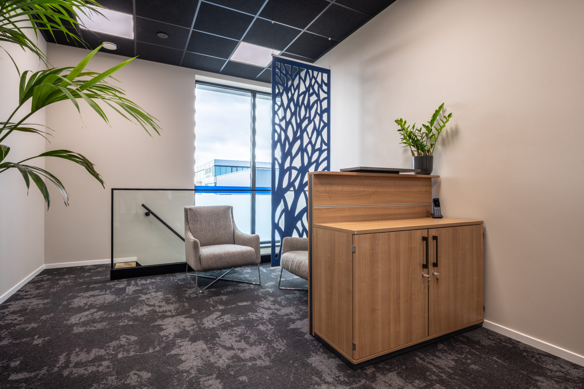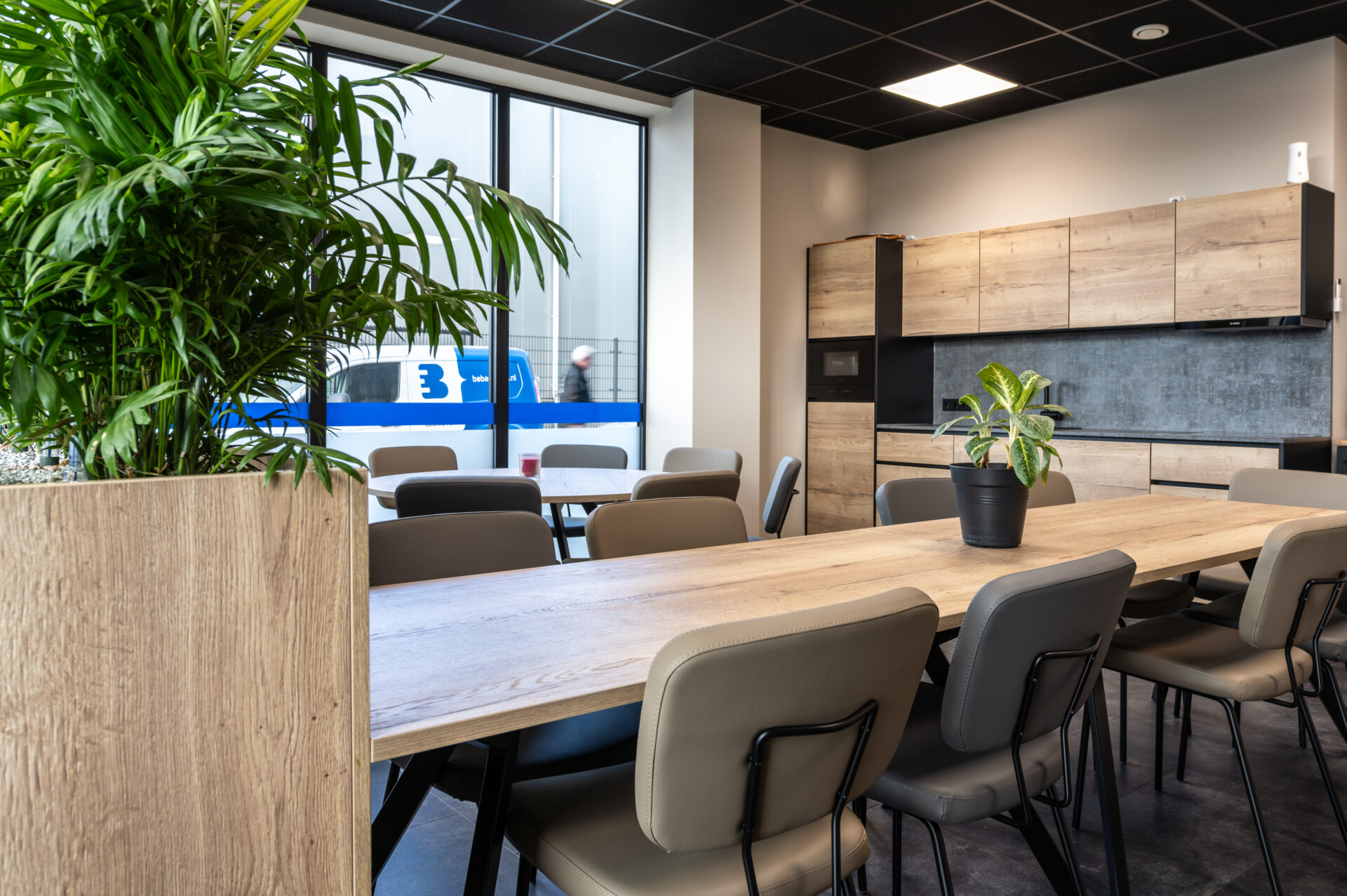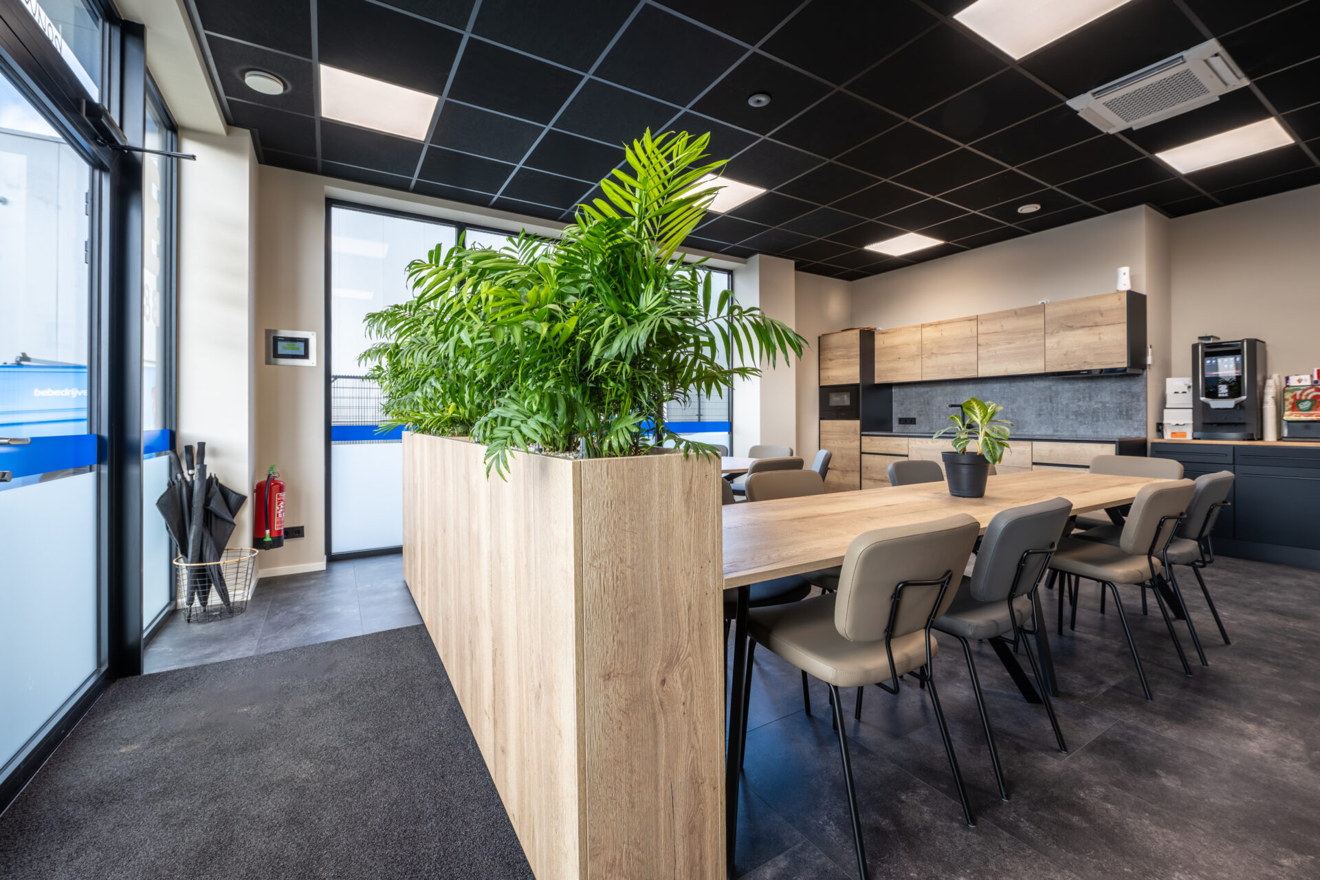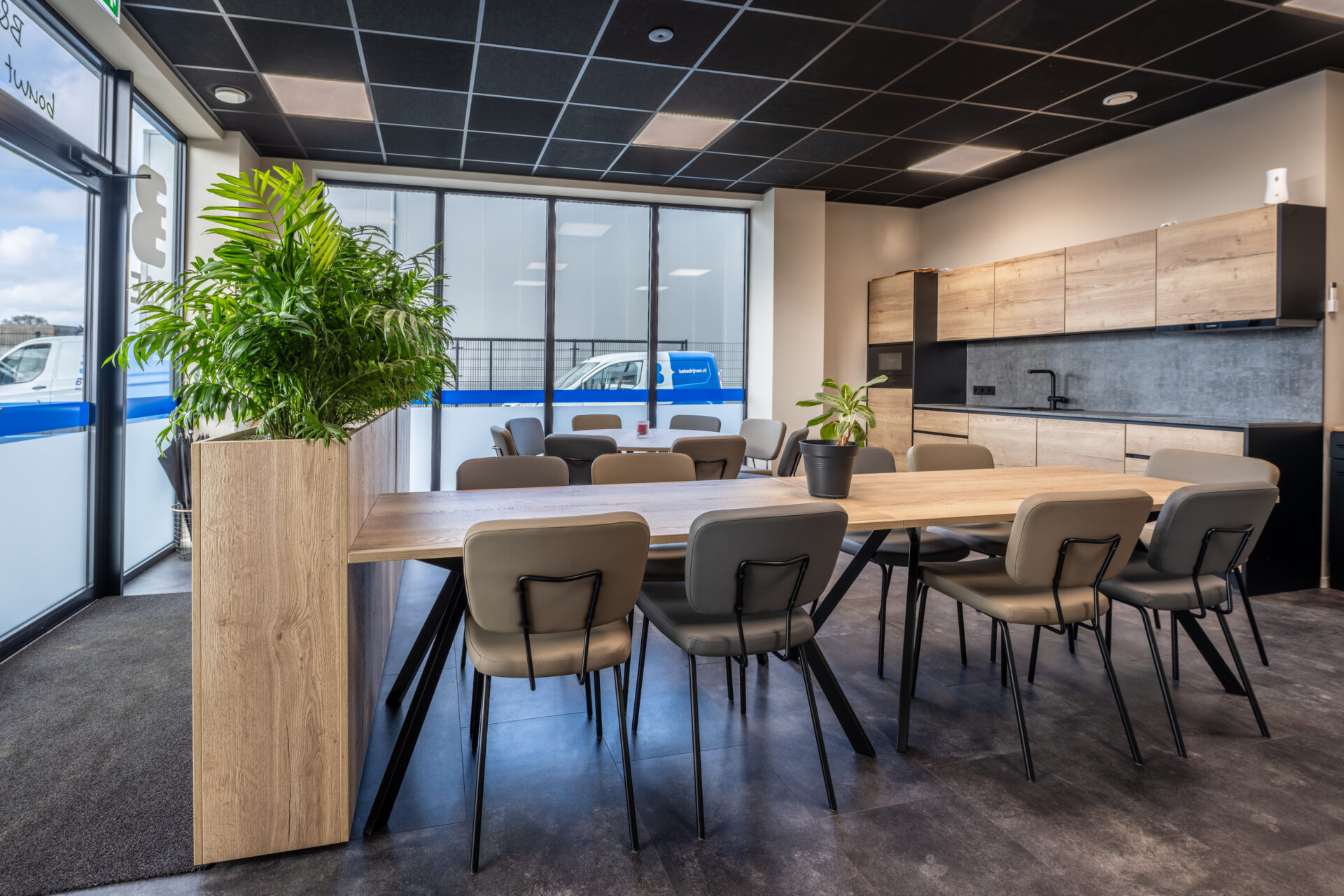 Binnen het nieuwe pand hebben wij gezorgd voor een inrichting die perfect aansluit bij deze praktische en professionele manier van werken. De sfeervolle kantine met functionele keuken vormt het hart van het gebouw – een plek waar medewerkers samenkomen, ontspannen en verbinden. Daarnaast hebben wij de pantry, de representatieve balie en de vergaderruimte op de verdieping ingericht, waarbij uitstraling en functionaliteit hand in hand gaan.
